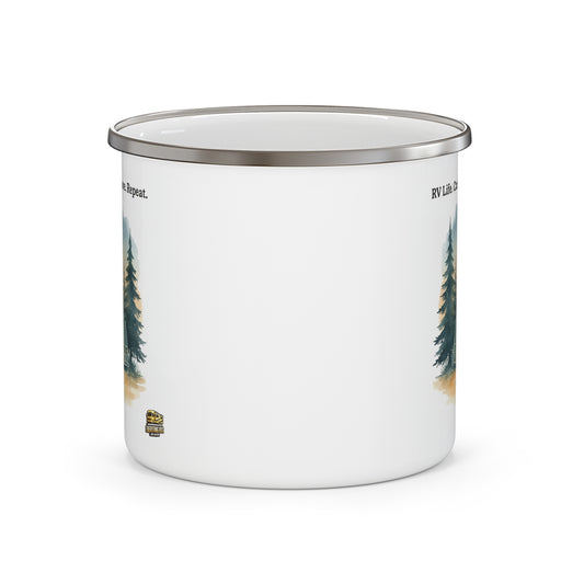 Enamel Camping Mug — "RV Life. Camp. Explore. Repeat." Retro Forest Camper Campfire Design